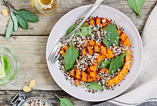 SALADA DE BATATA-DOCE COM QUEIJO FETA, ESPINAFRES E QUINOA (SEM GLÚTEN)